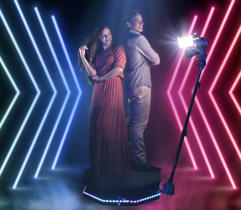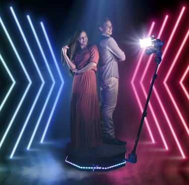 Los invitados se suben a una plataforma circular, mientras una cámara montada en un brazo giratorio los rodea, capturando video en alta calidad con efectos slow motion, reverse, boomerang y filtros especiales. En segundos, el sistema edita el video y lo entrega automáticamente por QR, WhatsApp o email. ¡Una mini producción cinematográfica en tiempo real!